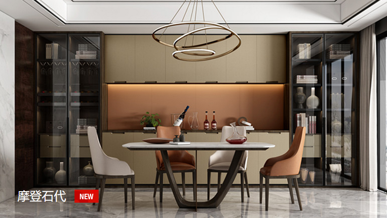 大胆的材料碰撞,铸就了个性非凡的摩登主义。岩板、金属、玻璃……当代质感的领航者相汇一处,新潮与精致便不言而喻。错落有致的藏酒格,集剔透感与漂浮感于一体的玻璃元素,加以隐藏式灯带,彰显出华丽的空间视觉,纹理丰富的岩板加持,让柜体在沉调与亮调中自由探索,摩登奢华之感留步于此。