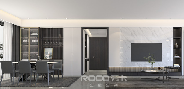 将中空台面和餐桌相连接,优化取酒动线,掩门柜体+开放格设计,收纳空间翻倍,多层地柜可放置碗盘等餐具,让酒柜收纳不再单调。